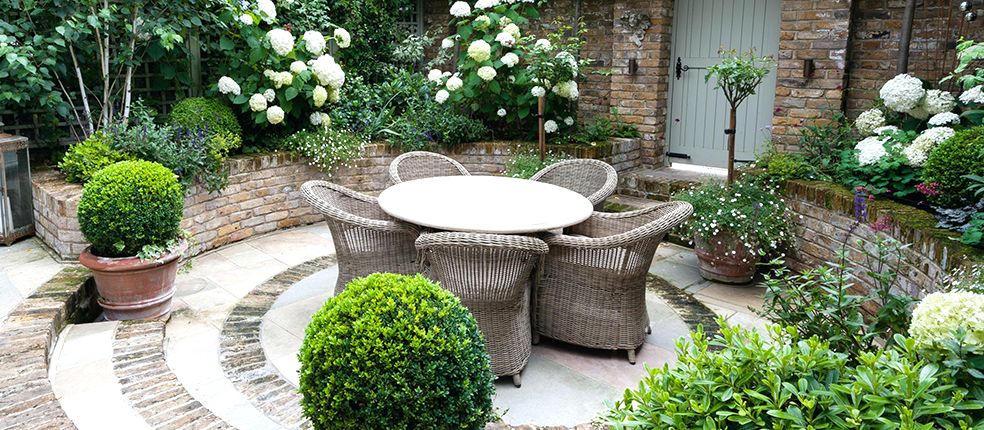 Классический стиль сада сопровождают белый, бежевый, песочный, голубой, светло-терракотовый цвета.